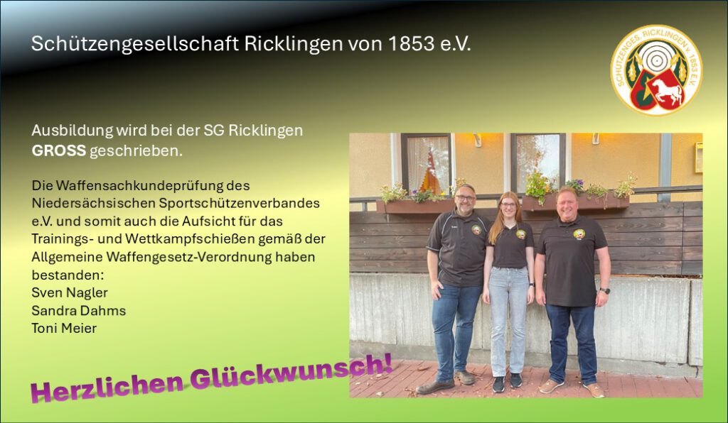 Zuerst nahmen einige Mitglieder an der Waffensachkundeprüfung des Niedersächsischen Sportschützenverbandes e.V. teil. Somit haben sie auch die Ausbildung für die Aufsicht beim Trainings- und Wettkampfschießen gemäß der Allgemeine Waffengesetz-Verordnung bestanden. Dies sichert unseren Trainingsbetrieb.