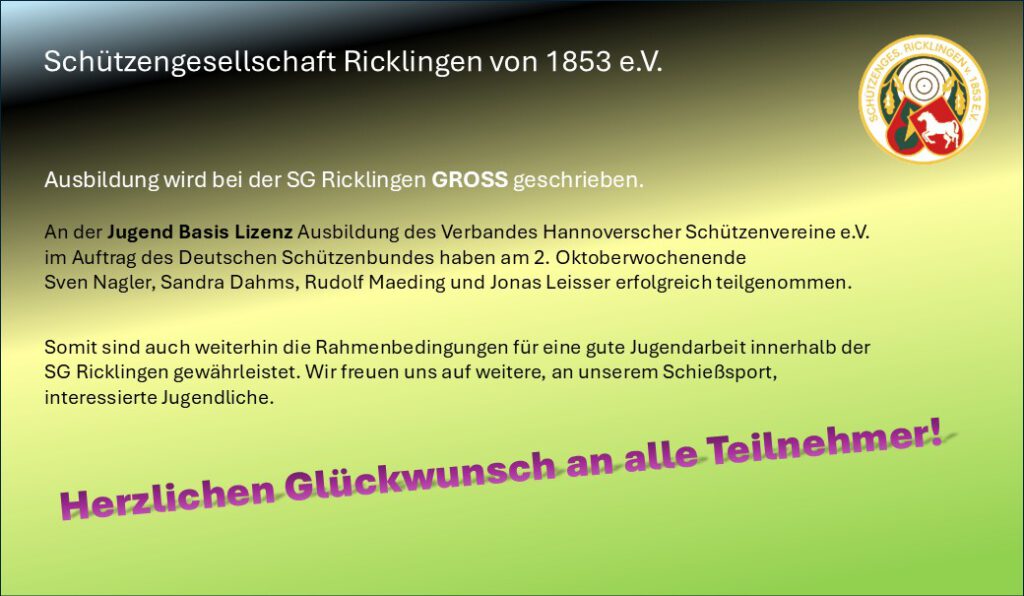 Des Weiteren fand am 2. Oktoberwochenende die Jugend Basis Lizenz Ausbildung des Verbandes Hannoverscher Schützenvereine e.V. statt. Gerade diese Ausbildung ist für unsere erfolgreiche Jugendarbeit ein absolutes Muss.