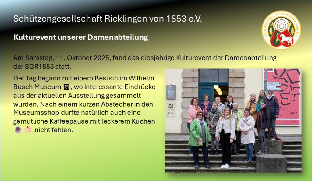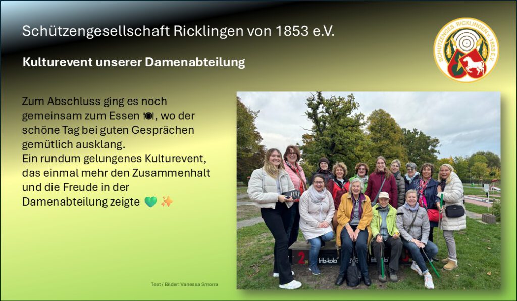 Kulturevent unserer Damenabteilung 19. Oktober 202519. Oktober 2025 ODa Einmal im Jahr tauschen unsere Damen die Sportgeräte gegen Kulturmomente … DO